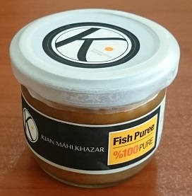 پوره ماهی حاوی ماهی قزل آلا، خاویار قزل آلا، زیتون، سیر، رب گوجه فرنگی، روغن زیتون و ادویه در بسته بندی شیشه ای 120 گرمی